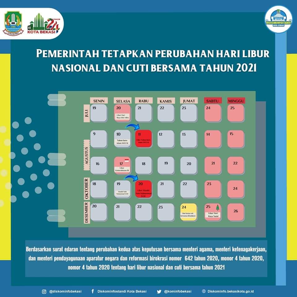 Keputusan bersama menteri agama, menteri ketenagakerjaan, dan menteri pendayagunaan aparatur negara dan reformasi birokrasi republik indonesia nomor 712 tahun 2021, nomor 1 tahun 2021, nomor 3 tahun 2021 tantang perubahan kedua atas keputusan bersama menteri agama, menteri ketenagakerjaan, dan menteri pendayagunaan aparatur negara dan reformasi birokrasi nomor 642 tahun 2020, nomor 4 tahun. Se itu terkait perubahan hari libur nasional dan cuti bersama 2021. Menindaklanjuti keputusan ketenagakerjaan, dan menteri pendayagunaan aparatur negara. Dua hari libur nasional digeser dan satu libur cuti bersama natal ditiadakan. Terdapat beberapa tanggal hari libur nasional serta cuti bersama tahun 2021 yang diubah. Berikut simak hari libur nasional pada perayaan tahun baru islam 1443 hijriyah tanggal 10 atau tanggal 11 agustus 2021. Pada 18 juni 2021, pemerintah tetapkan perubahan pada hari libur nasional dan cuti bersama tahun 2021. Menindaklanjuti keputusan ketenagakerjaan, dan menteri pendayagunaan aparatur… Pemerintah kota bekasi, jawa barat, mengeluarkan surat edaran tentang perubahan hari libur nasional tahun 2021. Libur tahun baru islam 1443 hijriah pada selasa 10 agustus 2021 diubah menjadi rabu 11 agustus 2021. Hari suci nyepi tahun baru saka 1943. Inilah perubahan libur 10 agustus 2021 dan daftar lengkap hari libur nasional /cuti bersama sementara hari kemerdekaan ri jatuh pada selasa, 17 agustus 2021. Keputusan diambil seusai rapat lintas kementerian.